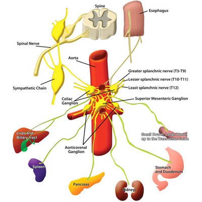 5- درد ناحیه روی معده تقریبا دو بند انگشت زیر جناغ: این ناحیه موسوم به نقطه شوک است که در طب هندی ملقب به چاکرای خورشیدی و شبکه خوشیدی میباشد. این نقطه از نظر فیزیولژیک با شبکه سمپاتیک سلیاک تطابق دارد. این شبکه یکی از مهمترین شبکه های سمپاتیک بوده که به بسیاری از احشاء عصب دهی مینماید و هم چنین شاخه هایی از عصب واگ هم در آن دخیل هستند. به اشکال زیر دقت کنید